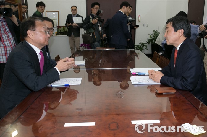 한편 이날 유 부총리는 국회를 찾아 원유철 새누리당 대표 권한대행과 이종걸 더민주 원내대표, 박지원 국민의당 신임 원내대표와 장병완 정책위의장을 차례로 면담하며 19대 국회에서 주요 쟁점법안의 처리를 당부했다.이종걸(오른쪽) 더불어민주당 원내대표가 29일 오전 서울 여의도 국회에서 경제활성화법안 등 처리 요청을 위해 방문한 유일호 경제부총리 겸 기획재정부 장관과 면담하고 있다. 2016.04.29 박동욱 기자