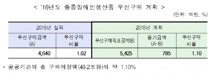 이 계획은 2015년 구매실적 4640억 원에 비해 785억원이 증가한 규모로써 중증장애인생산품 우선구매 촉진위원회(위원장, 보건복지부차관)의 심의를 거쳐 확정됐다.