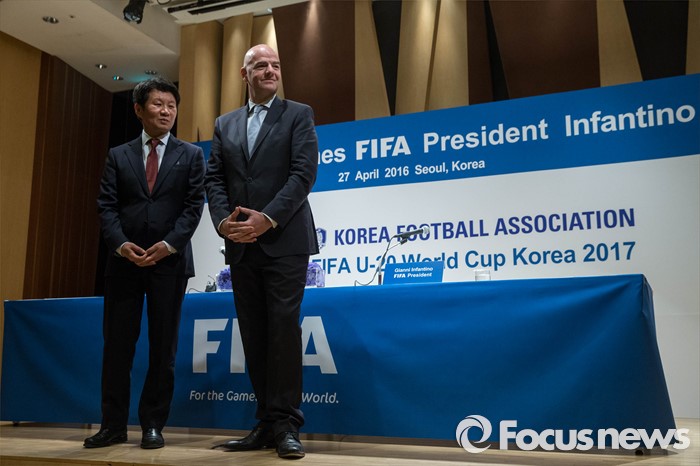 (서울=포커스뉴스) 한국을 방문한 지아니 인판티노(46, 스위스) FIFA 회장이 27일 오후 서울 강남구 아이파크타워에서 열린 기자회견에 참석, 정몽규 대한축구협회장과 함께 행사 시작을 기다리고 있다.