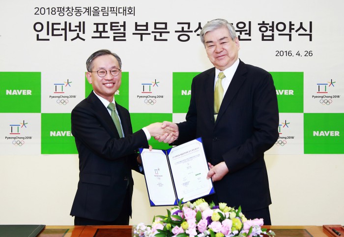김상헌 네이버 대표는 "다양한 국제 스포츠 대회를 서비스하며 쌓아온 노하우를 바탕으로 평창 동계올림픽이 세계 최고 수준의 대회가 될 수 있도록 네이버가 가진 인프라를 아낌없이 지원하겠다"고 밝혔다.이날 협약식은 서소문 조직위원회 사무실에서 조양호 평창조직위원장(오른쪽)과 네이버 김상헌 대표 등이 참석한 가운데 이뤄졌다.