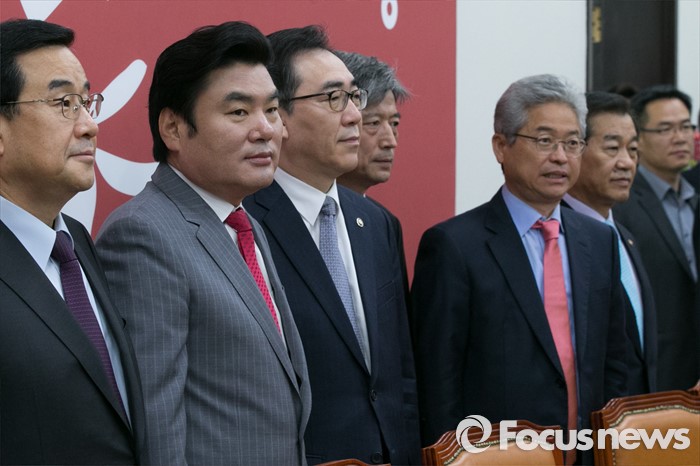 (서울=포커스뉴스) 28일 오전 서울 여의도 국회에서 대북 관련 긴급 안보 대책회의 참석자들이 기념사진을 찍고 있다. 왼쪽부터 김정훈 새누리당 정책위의장, 원유철 대표최고위원 권한대행, 조태열 외교부 2차관, 황부기 통일부 차관, 이철우 정보위 간사, 황인무 국방부 차관.
