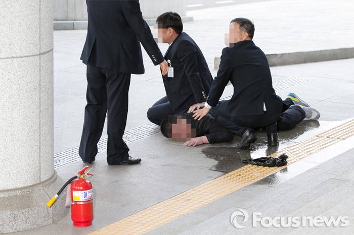(서울=포커스뉴스) 25일 오후 서울 여의도 국회 의원회관 앞에서 신원 미상의 한 중년 남성이 분신 시도를 하려다, 국회 방호원들에게 제압당하고 있다.
