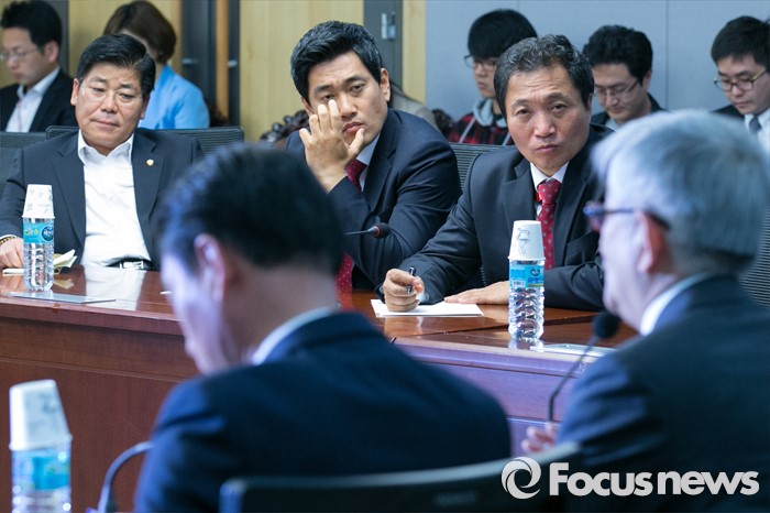 (서울=포커스뉴스) 최장집(앞줄 오른쪽 뒷모습) 고려대 명예교수가 25일 오후 서울 여의도 국회 의원회관에서 새누리당 혁신모임 외부인사 간담회에 초청되어 강연하는 동안, 의원들이 경청하고 있다.