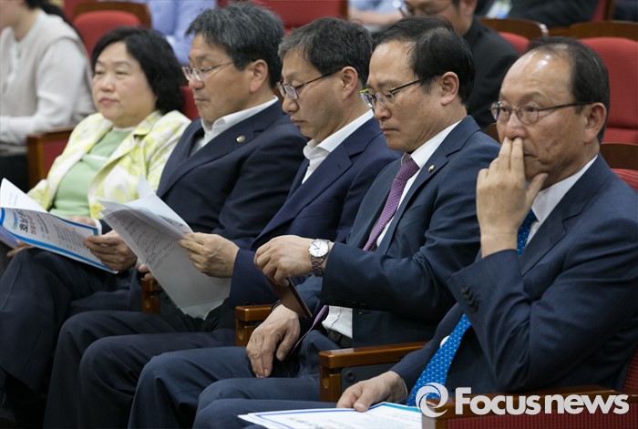 (서울=포커스뉴스) 28일 오후 서울 여의도 국회 의원회관에서 열린 더불어민주당의 호남 총선 평가 성찰과 대안 토론회에 참석한 의원들이 토론회를 지켜보고 있다. 왼쪽부터 인재근, 강기정, 김성주, 홍영표 의원, 최운열 비례대표 당선인.