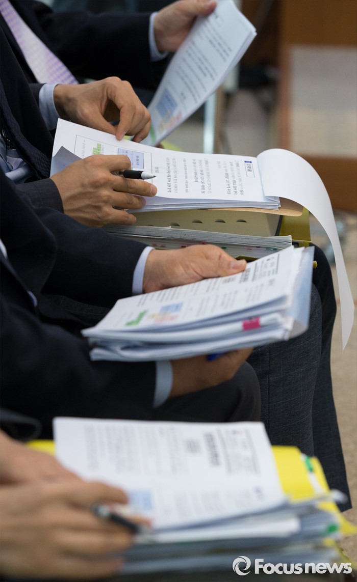 (세종=포커스뉴스) 26일 오전 세종시 정부세종청사 공정거래위원회 기자실에서 김성환 카르텔조사국장이 LNG 저장탱크 건설공사 입찰담합한 13개 건설사를 적발, 제재했다고 밝혔다. 카르텔 직원들이 관려 ㄴ자료를 살피고 있다.