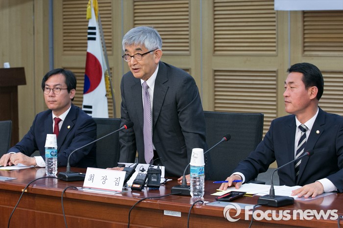 (서울=포커스뉴스) 최장집(가운데) 고려대 명예교수가 25일 오후 서울 여의도 국회 의원회관에서 새누리당 혁신모임 외부인사 간담회에 초청되어 강연 전 인사하고 있다.