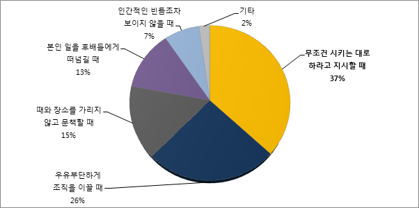 ‘이럴 때 리더를 대하기 어렵다’는 항목에는 ‘상사가 무조건 시키는 대로 하라고 지시할 때(37%)’, ‘우유부단하게 조직을 이끌 때(26%)’를 가장 많이 꼽았다. 이어 ‘때와 장소를 가리지 않고 문책할 때(15%)’, ‘본인 일을 후배들에게 다 떠넘길 때(13%)’, ‘인간적인 빈틈조차 보이지 않을 때(7%)’라는 답변도 있었다.