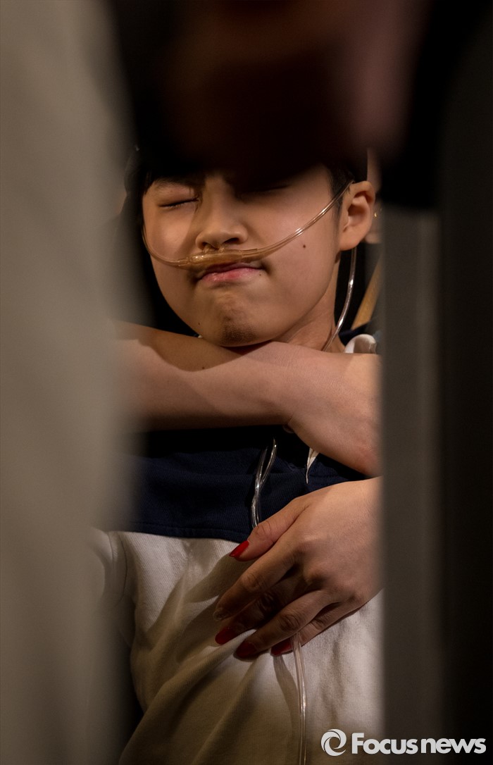 (서울=포커스뉴스) 2일 오전 서울 영등포구 콘래드호텔에서 열린 '옥시레킷벤키저(현 RB코리아) 가습기 살균제 파동' 관련 기자회견에서 피해자 임성준 군이 고통스러운 표정을 짓고 있다.