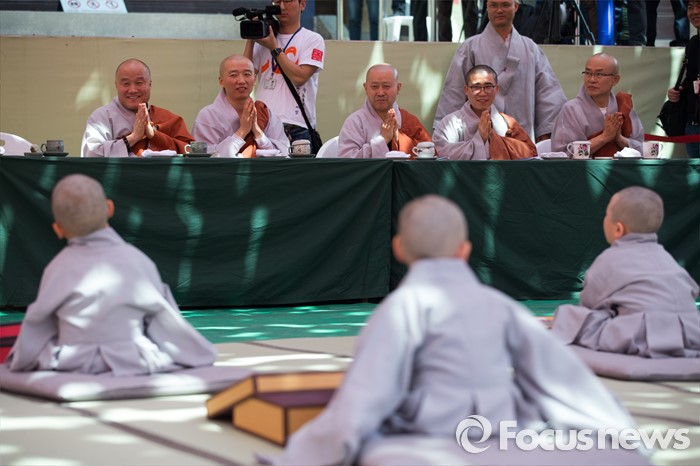 (서울=포커스뉴스) 2일 오전 서울 종로구 조계사 대웅전 앞마당에서 열린 동자승 단기출가 보리수 새싹학교 삭발, 수계식에서 동자승들이 삭발한 뒤 스님들이 합장을 하고 있다.