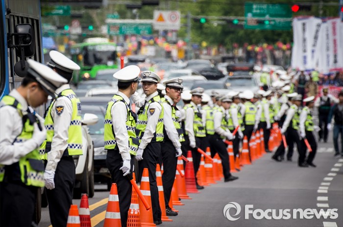 (서울=포커스뉴스) 근로자의날을 맞은 1일 오후 서울광장에서 열린 한국노총 5.1 전국노동자대회를 마친 참가자들이 종로로 행진을 이어가고 있다.