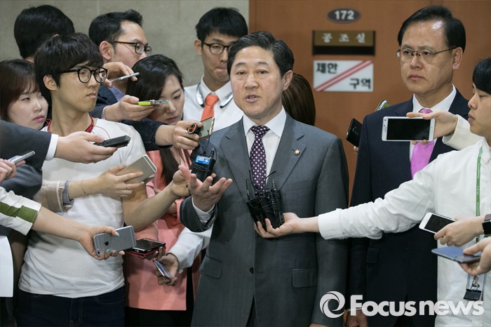 (서울=포커스뉴스) 유기준(왼쪽) 새누리당 의원이 28일 오후 서울 여의도 국회 정론관에서 정책위의장 러닝메이트 후보인 이명수 의원과 원내대표 출마 기자회견을 마친 뒤 취재진 질문에 답하고 있다.