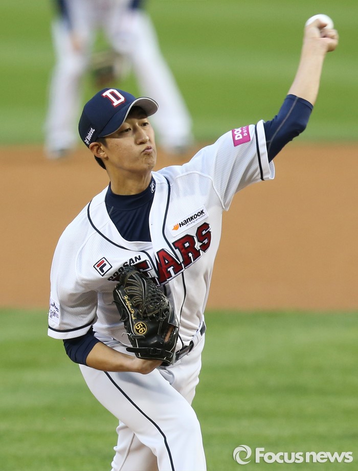 (서울=포커스뉴스) 27일 서울 잠실구장에서 열린 2016 프로야구 SK-두산 경기에서 1회초 두산 선발투수 허준혁이 투구하고 있다.
