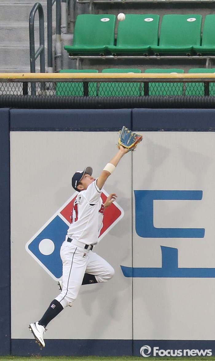 (서울=포커스뉴스) 26일 서울 잠실구장에서 열린 2016 프로야구 SK-두산 경기 1회초 1사 1루에서 두산 중견수 정수빈이 SK 최정의 타구를 잡으려 펜스 앞에서 점프하고 있다.