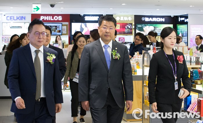 (서울=포커스뉴스) 29일 오전 서울 종로구 SM면세점 서울점에서 열린 그랜드 오픈식에 참석한 권희석(왼쪽) SM면세점 대표이사와 내빈들이 매장을 둘러보고 있다.