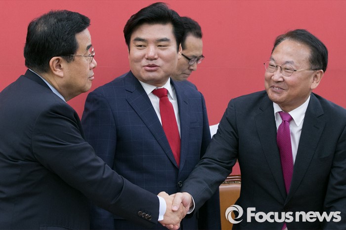 | △ 與 원내지도부와 악수하는 유일호 |