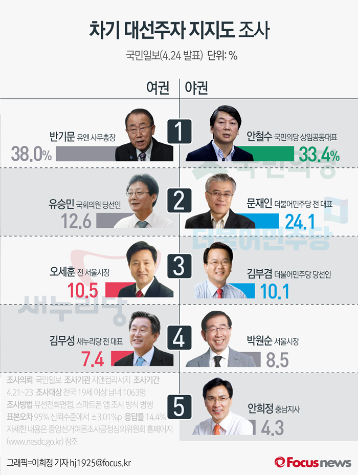 (서울=포커스뉴스) 국민일보가 여론조사기관 지앤컴리서치에 의뢰해 24일 발표한 차기 대선주자 지지도 조사 결과에 따르면 여권은 반기문 유엔 사무총장이 38.0%, 야권에서는 안철수 국민의당 상임공동대표가 33.4%로 선두를 달리고 있다.