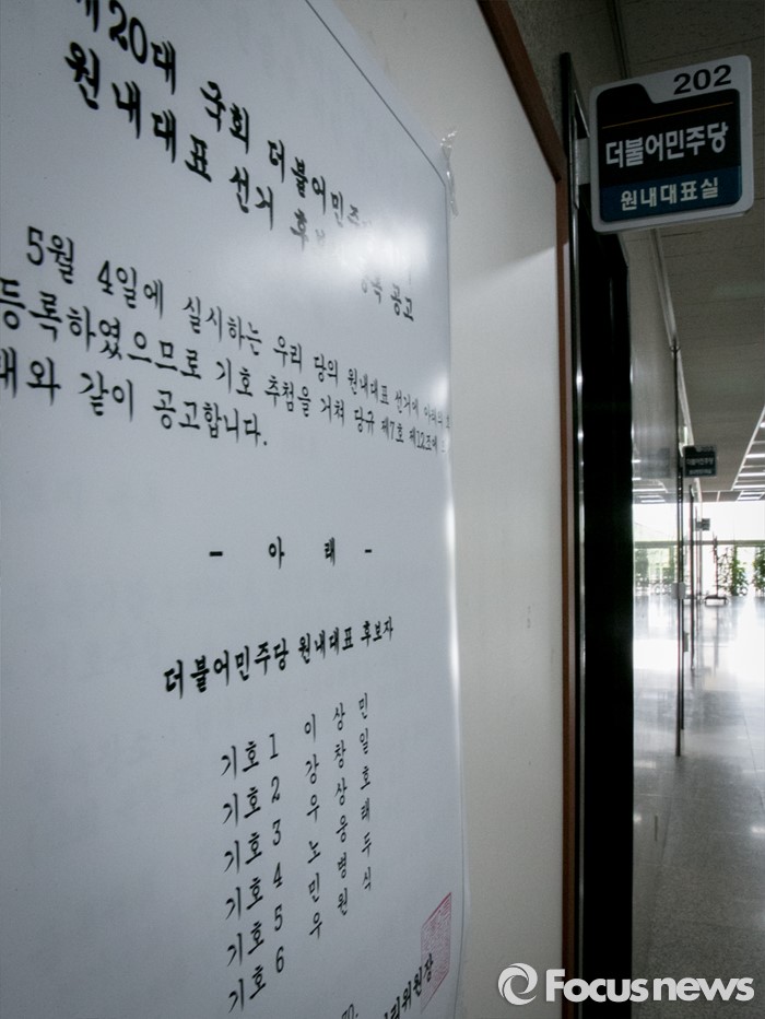 (서울=포커스뉴스) 더불어민주당의 20대 국회 첫 원내대표 선출을 이틀 앞둔 2일 오후 서울 여의도 국회 더불어민주당 원내대표실 앞에 원내대표 선거 후보자 등록 공고문이 게시되어 있다.
