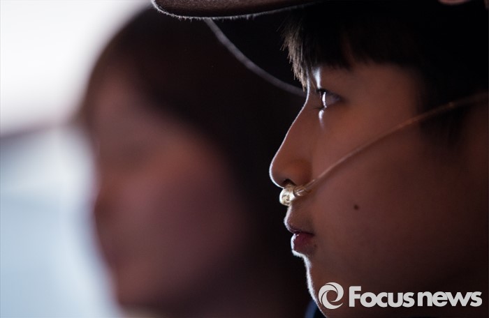 (서울=포커스뉴스) 2일 오전 서울 영등포구 콘래드호텔에서 열린 '옥시레킷벤키저(현 RB코리아) 가습기 살균제 파동' 관련 기자회견장 앞에서 가습기 살균제 피해자 임성준 군이 생각에 잠겨 있다. 뒤는 어머니 권미애 씨.