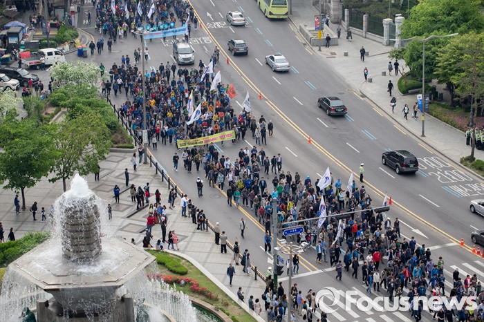 (서울=포커스뉴스) 30일 오후 서울역 광장에서 민주노총 공공운수 전국철도노동조합 회원들이 '철도노동자 1차 총력 결의대회'를 마치고 시내를 행진하고 있다.
