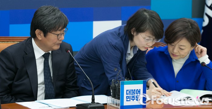 (서울=포커스뉴스) 29일 오전 서울 여의도 국회에서 열린 더불어민주당 보수단체 불법자금지원 의혹규명 진상조사 태스크포스(TF) 1차 회의에 참석한 이춘석(왼쪽) 위원장과 진선미(오른쪽) 의원이 관계자와 대화하고 있다.