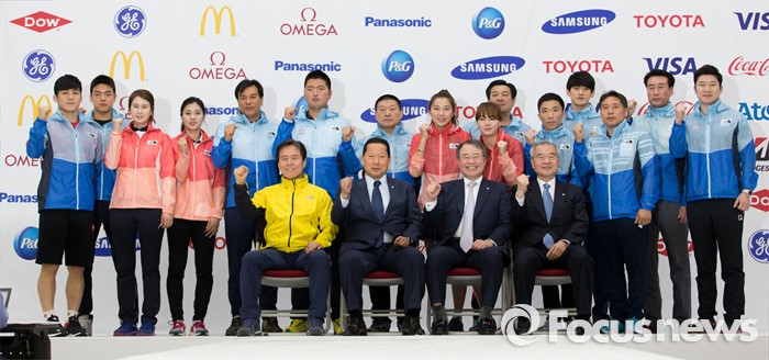 (서울=포커스뉴스) 27일 오후 서울 노원구 태릉선수촌에서 제31회 리우하계올림픽대회 D-100일 미디어데이에 참석한 대한체육회장과 선수단장, 선수들이 파이팅을 외치며 기념촬영을 하고 있다.