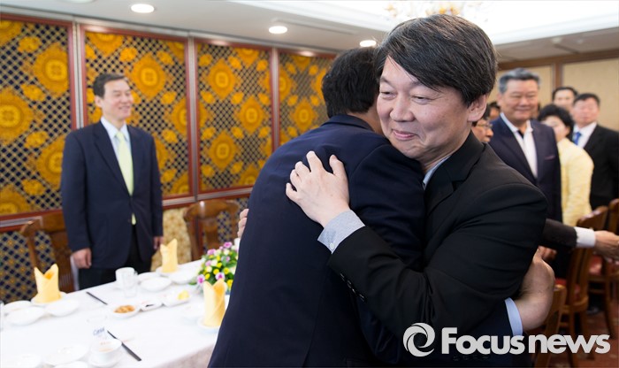 (서울=포커스뉴스) 안철수 국민의당 상임공동대표가 25일 오후 서울 영등포구의 한 중식당에서 제20대 국회의원 선거 서울지역 출마자들과 오찬간담회에 앞서 포옹을 하고 있다.