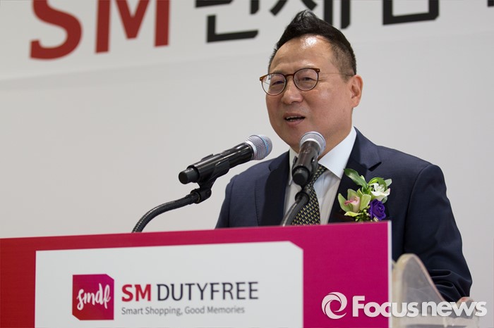 (서울=포커스뉴스) 29일 오전 서울 종로구 SM면세점 서울점에서 열린 그랜드 오픈식에 참석한 권희석 SM면세점 대표이사가 인사말을 하고 있다.