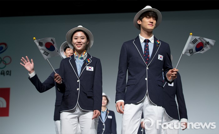 (서울=포커스뉴스) 27일 오후 서울 노원구 태릉선수촌에서 열린 제31회 리우하계올림픽대회 D-100일 미디어데이에서 펜싱 국가대표 김지연(왼쪽부터)과 태권도 국가대표 이대훈이 리우올림픽 선수단 단복을 선보이고 있다.