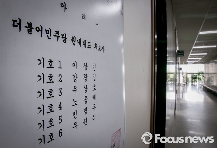 (서울=포커스뉴스) 더불어민주당의 20대 국회 첫 원내대표 선출을 이틀 앞둔 2일 오후 서울 여의도 국회 더불어민주당 원내대표실 앞에 원내대표 선거 후보자 등록 공고문이 게시되어 있다.