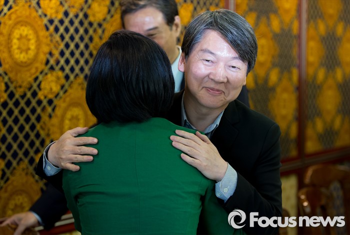 (서울=포커스뉴스) 안철수 국민의당 상임공동대표가 25일 오후 서울 영등포구의 한 중식당에서 제20대 국회의원 선거 서울지역 출마자들과 오찬간담회에 앞서 포옹을 하고 있다.