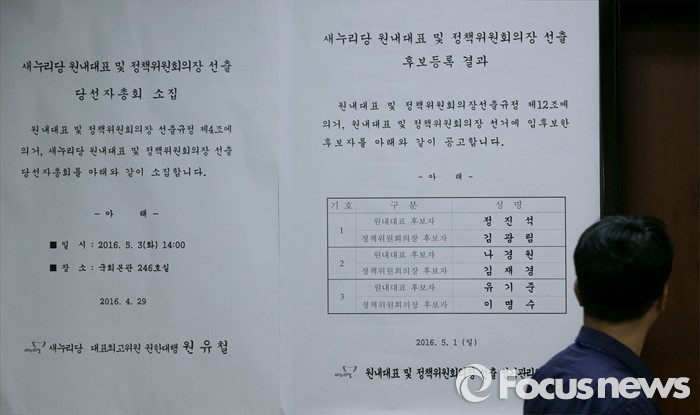(서울=포커스뉴스) 새누리당의 20대 국회 첫 원내대표 선출을 하루 앞둔 2일 오후 서울 여의도 국회 새누리당 사무실 앞에 원내지도부 선출을 위한 당선자총회를 알리는 공고문이 게시되어 있다.