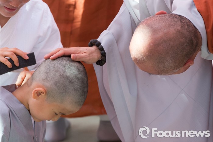 (서울=포커스뉴스) 2일 오전 서울 종로구 조계사 대웅전 앞마당에서 열린 동자승 단기출가 보리수 새싹학교 삭발, 수계식에서 동자승들이 삭발을 하고 있다.