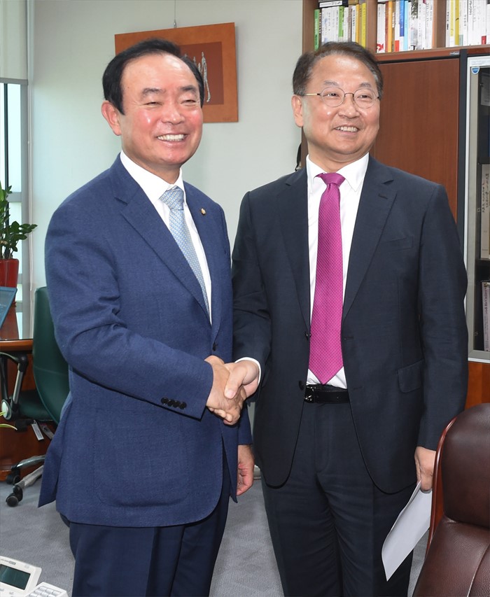 (서울=포커스뉴스) 장병완(왼쪽) 국민의당 정책위의장이 29일 오전 서울 여의도 국회 의원회관에서 경제활성화법안 등 처리 요청을 위해 방문한 유일호 경제부총리 겸 기획재정부 장관과 면담에 앞서 악수하고 있다.<사진제공=기획재정부>