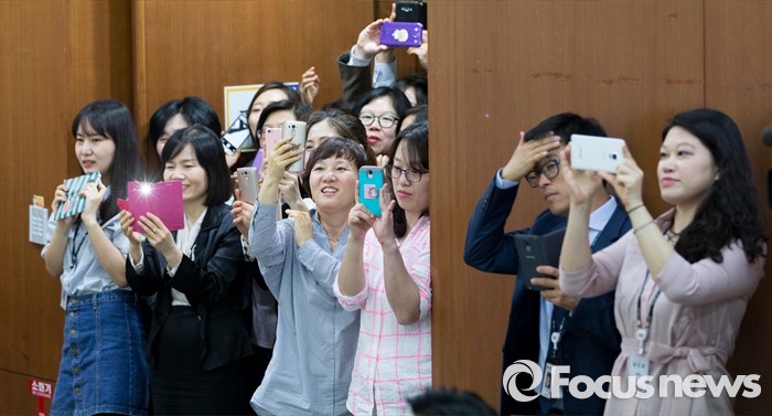 (서울=포커스뉴스) 26일 오후 서울 종로구 서울지방국세청에서 국세청 직원들이 홍보대사로 위촉된 조인성과 최지우를 기념촬영하고 있다.
