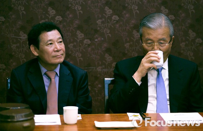 (광주=포커스뉴스) 김종인 더불어민주당 비대위 대표가 25일 오후 광주의 한 음식점에서 열린 당지도부·출마자·단체장 오찬 간담회에 참석해 물을 마시고 있다. 왼쪽은 윤장현 광주시장.