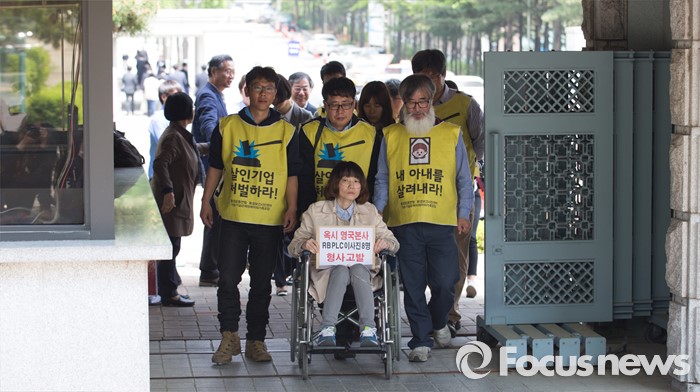 (서울=포커스뉴스) 2일 오후 서울 서초구 서울중앙지방검찰청에 가습기살균제 피해자와 가족모임과 환경보건시민센터 관계자들이 옥시레킷벤키저 대표 등 8명의 이사진을 형사고발 하기 위해 들어서고 있다.
