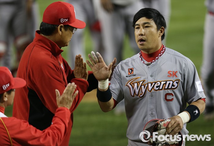 (서울=포커스뉴스) 27일 서울 잠실구장에서 열린 2016 프로야구 SK-두산 경기에서 3-1로 승리한 후 SK 김강민이 김용희 감독과 하이파이브를 하고 있다.