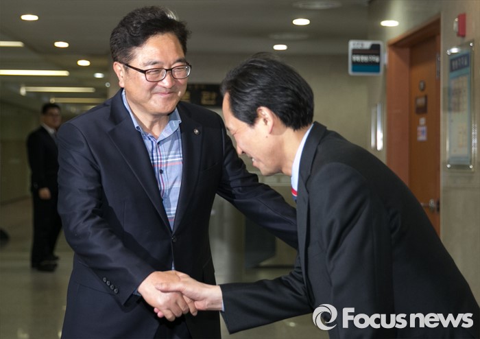 (서울=포커스뉴스) 더불어민주당 원내대표 경선에 출마하는 우원식(왼쪽), 우상호 의원이 29일 오후 서울 여의도 국회 정론관 앞에서 만나 인사하고 있다.