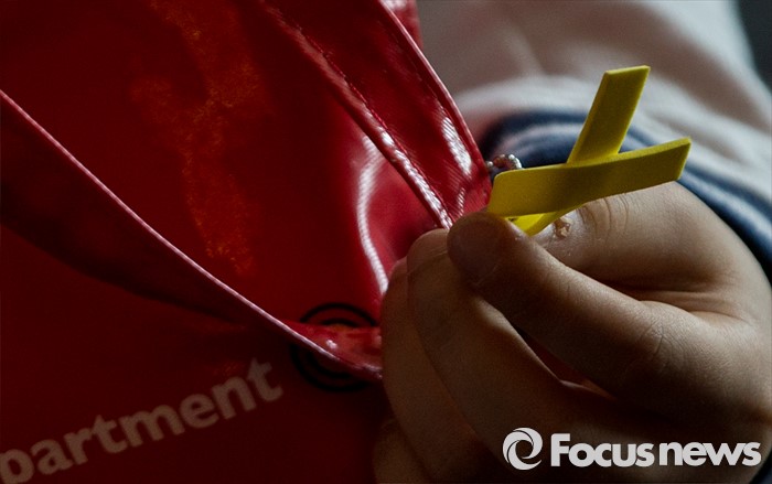 (서울=포커스뉴스) 2일 오전 서울 영등포구 콘래드호텔에서 열린 '옥시레킷벤키저(현 RB코리아) 가습기 살균제 파동' 관련 기자회견장 앞에서 가습기 살균제 피해자 임성준 군이 세월호 추모 리본을 만지고 있다.