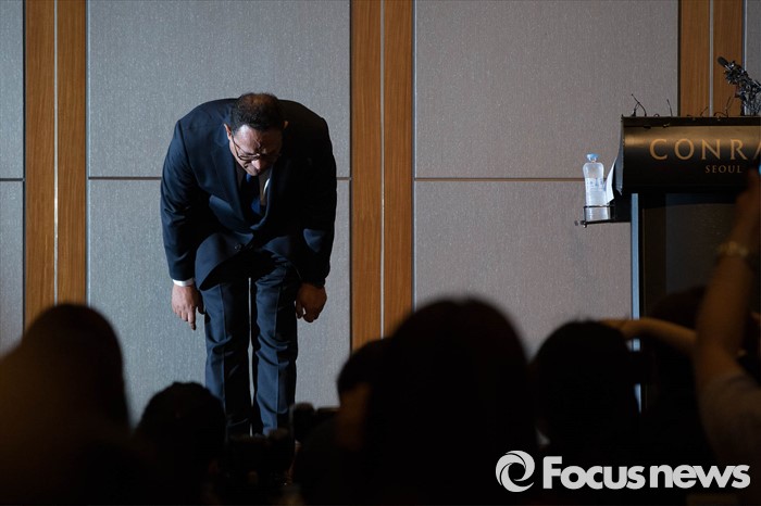 (서울=포커스뉴스) 지난 2011년 가습기 살균제 사망사건이 발생한지 5년 만에 옥시레킷벤키저 한국법인장 아타 샤프달 대표가 2일 오전 서울 영등포구 콘래드호텔에서 기자회견을 열고 입장을 밝히고 있다.