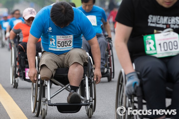 (서울=포커스뉴스) 30일 오전 서울 송파구 잠실종합운동장 인근에서 열린 '제24회 서울국제휠체어마라톤대회'에서 참가자들이 힘차게 출발하고 있다.