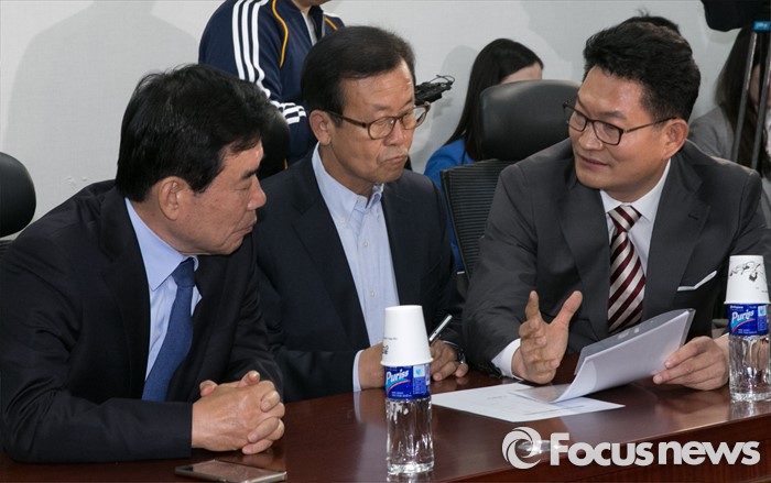 (서울=포커스뉴스) 29일 오전 서울 여의도 국회 의원회관에서 전당대회 연기론 등 논의를 위해 진행된 더불어민주당 4선 이상 중진모임에 참석한 송영길(오른쪽부터) 당선인, 원혜영 의원, 김진표 당선인이 대화하고 있다. 이날 모임에는 강창일, 변재일, 이상민, 안민석, 설훈, 박병석, 오제세, 이상민, 문희상 의원과 김진표, 송영길 당선인 등이 참석했다.
