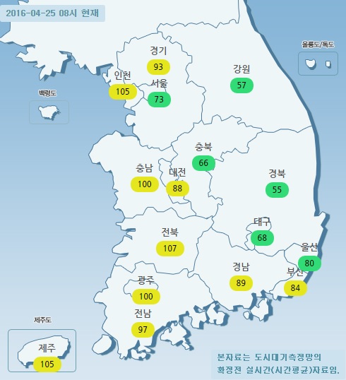 25일 오전 8시 기준 평균 미세먼지(PM10) 농도 현황은 서울 73㎍/㎥, 경기 93㎍/㎥, 인천 105㎍/㎥, 대전 88㎍/㎥, 전북 107㎍/㎥, 광주 100㎍/㎥, 부산 84㎍/㎥, 대구 68㎍/㎥, 강원 57㎍/㎥, 제주 105㎍/㎥ 이다.