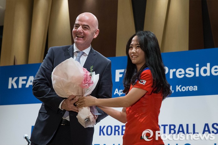 (서울=포커스뉴스) 한국을 방문한 지아니 인판티노(46, 스위스) FIFA 회장이 27일 오후 서울 강남구 아이파크타워에서 열린 기자회견에 참석, 축구유망주 이민아 선수로부터 꽃다발을 전달받고 있다.