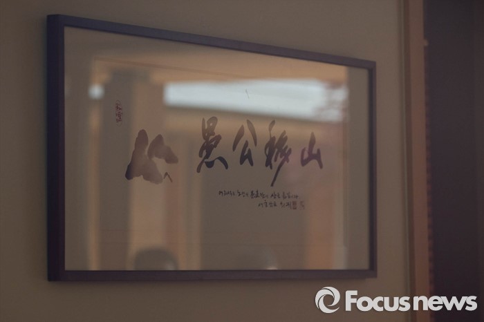 (김해=포커스뉴스) 고 노무현 전 대통령 서거 7주기를 앞두고 1일 오전 노 전 대통령의 사저가 공개되고 있다. 사진은 고 신영복 선생이 노 전 대통령에게 선물한 '우공이산' 액자.