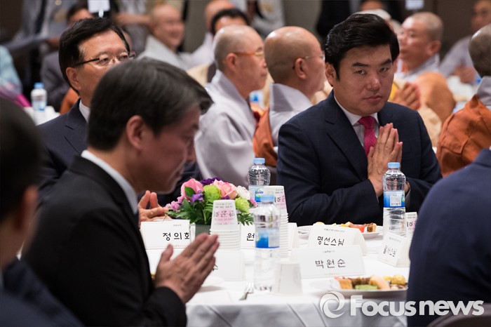(서울=포커스뉴스) 2일 오후 서울 중구 프레스센터에서 열린 BBS 불교방송 개국 26주년 기념 비전선포식에 참석한 원유철(오른쪽) 새누리당 원내대표와 안철수 국민의당 상임공동대표가 합장을 하고 있다.