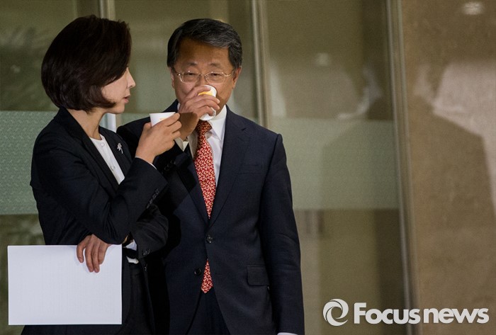 (서울=포커스뉴스) 새누리당 차기 원내대표 경선 후보등록 마감 예정일인 1일 오전 서울 여의도 국회 정론관 앞에서 차기 원내대표 후보인 나경원 의원과 정책위의장 후보 김재경 의원이 기자회견을 기다리고 있다.