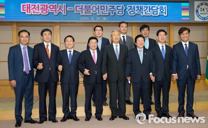 (대전=포커스뉴스) 김종인 더불어민주당 비대위 대표와 이종걸 원내대표를 비롯한 더민주 의원 및 당직자들이 28일 오후 대전시청을 방문한 가운데 대회의실에서 열린 더불어민주당-대전시 정책간담회에서 김종인 대표가 기념촬영을 하고 있다.