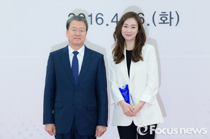 (서울=포커스뉴스) 26일 오후 서울 종로구 서울지방국세청에서 2016 국세청 홍보대사로 위촉된 배우 최지우(오른쪽)가 임환수 국세청장과 기념촬영을 하고 있다.