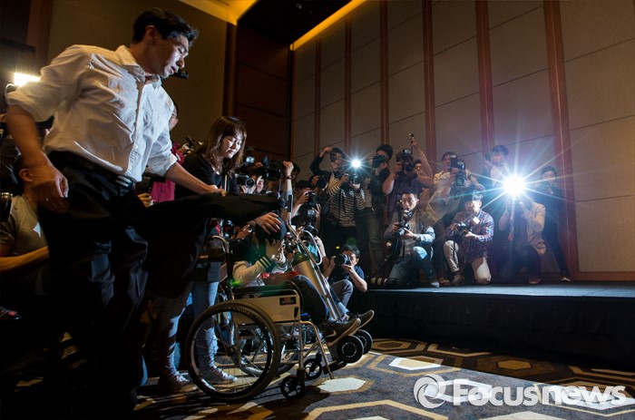 (서울=포커스뉴스) 2일 오전 서울 영등포구 콘래드호텔에서 열린 '옥시레킷벤키저(현 RB코리아) 가습기 살균제 파동' 관련 기자회견에서 아타 울라시드 사프달 옥시코리아 대표가 피해자 임성준 군에게 사과하고 있다.